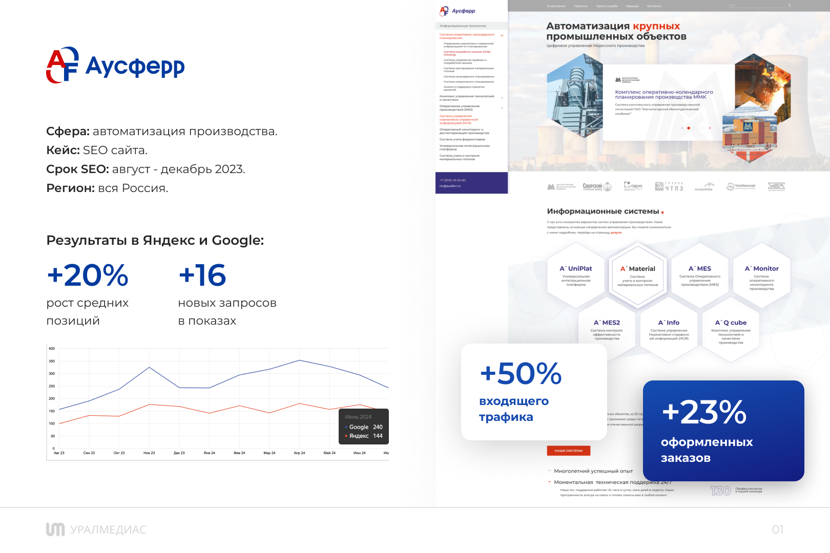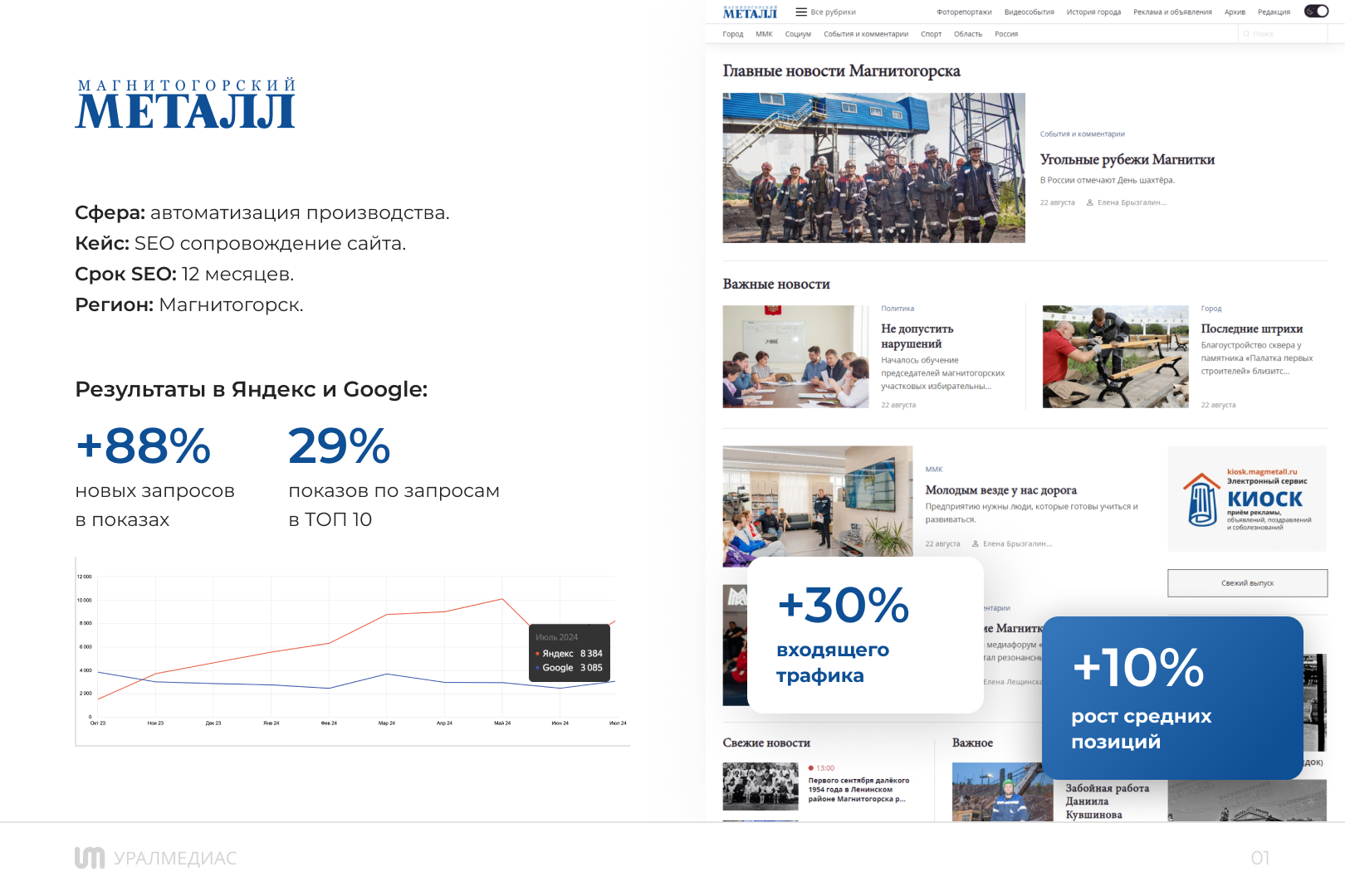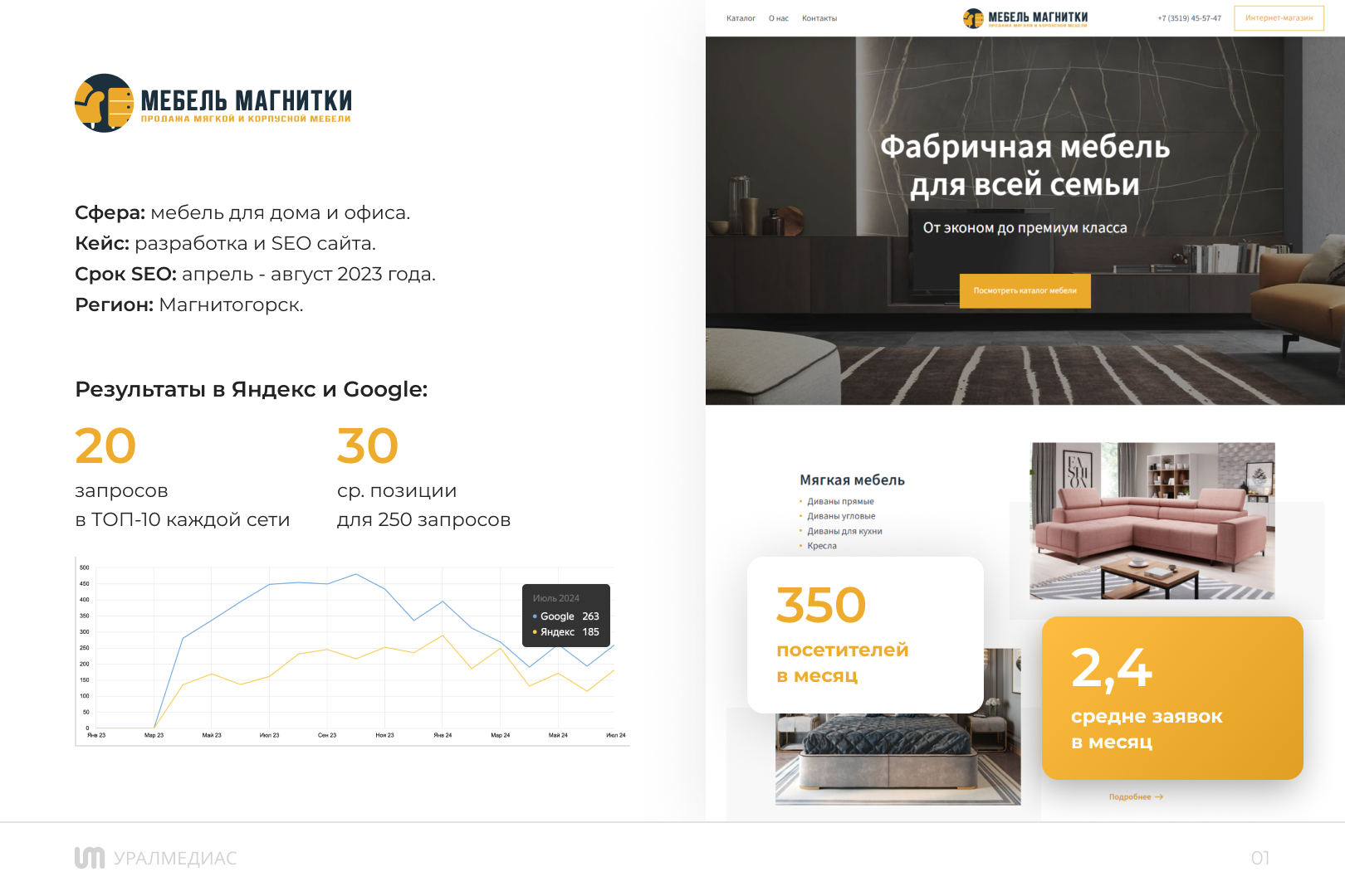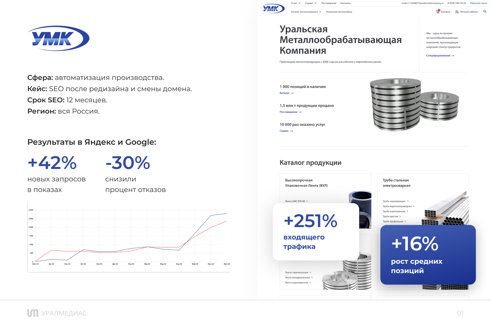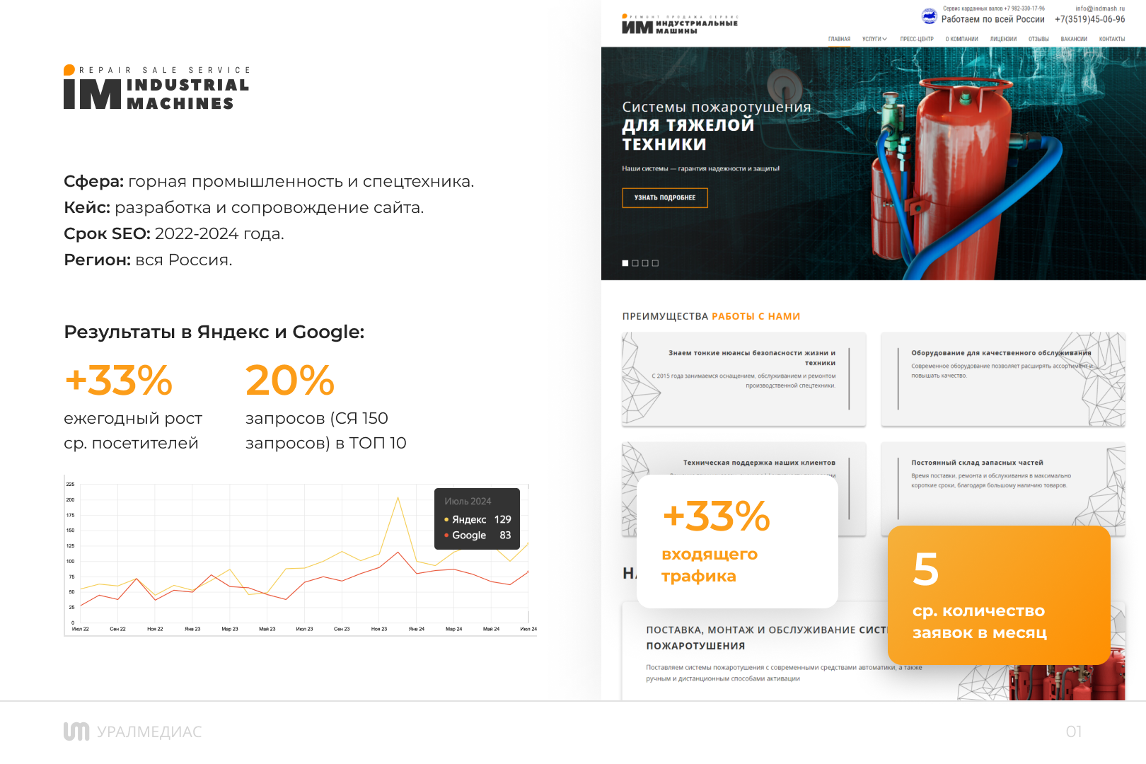 Сайт — это сложный цифровой продукт, который требует постоянного внимания и обновлений. Один человек физически не может закрыть задачи по аналитике, разработке, дизайну, контенту и SEO. В Uralmedias над проектом работает IT команда экспертов, с опытом в промышленности, ритейле, e-commerce и B2B.